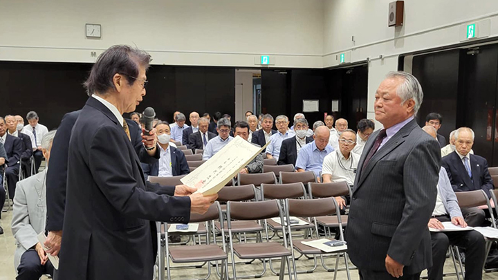 令和7年度一般社団法人神奈川県剣道連盟社員総会において、神之薗文男先生への杖道範士称号証書伝達がありました。
